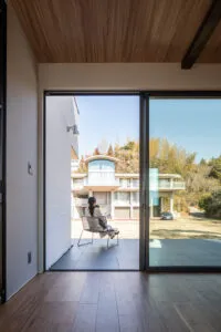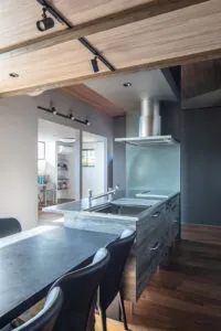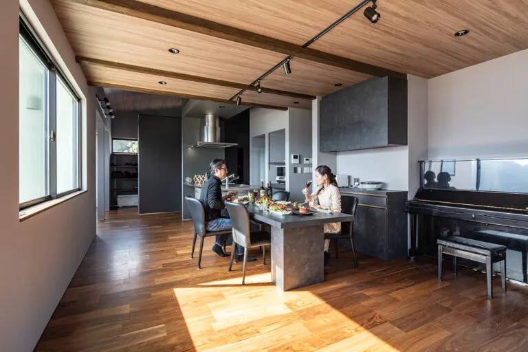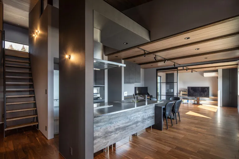母屋の視界を妨げない高さで、家事や育児といった日常のほとんどを1階だけで過ごせる平屋にちょっとしたプラスαを。そしてキッチンやリビングからの眺望が特徴的だ。