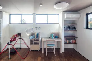 またキッズスペースや2階のフリールームなどに、家族がどこにいても互いの気配を感じられ、程良い距離感を保つことができる。