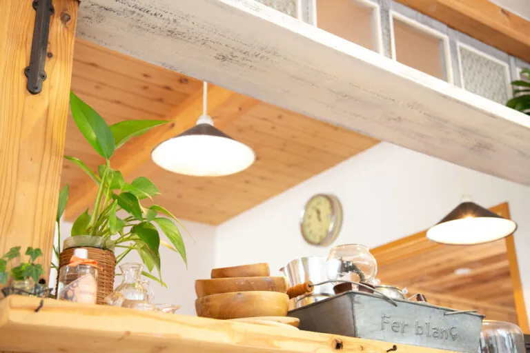 木のやわらかさが引き立つ棚も自分たちでDIY。