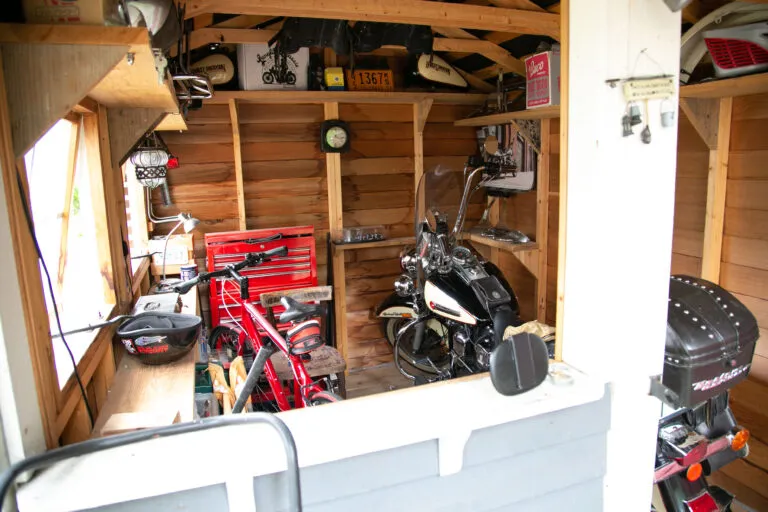 バイク車庫を作りたいとキットを購入し、夫婦で作り上げた。