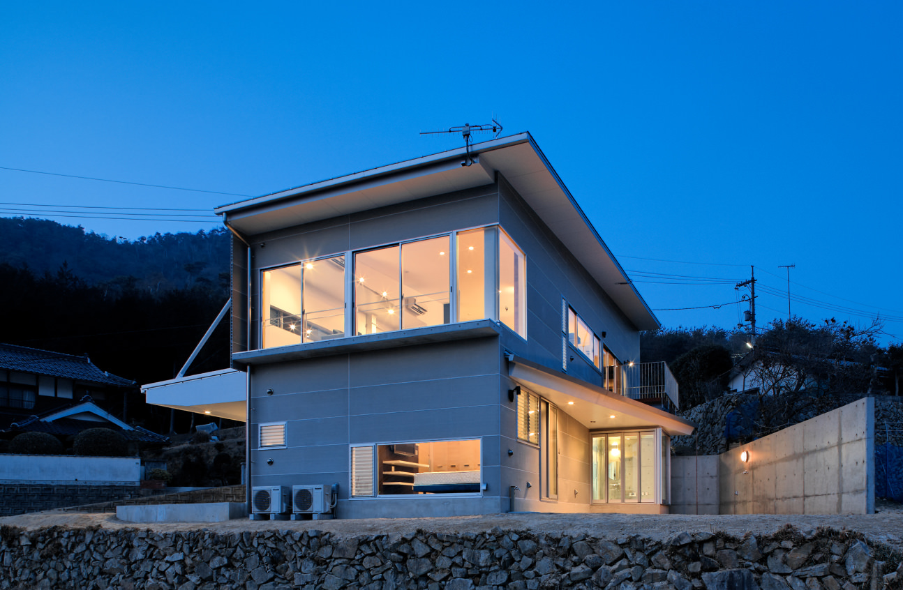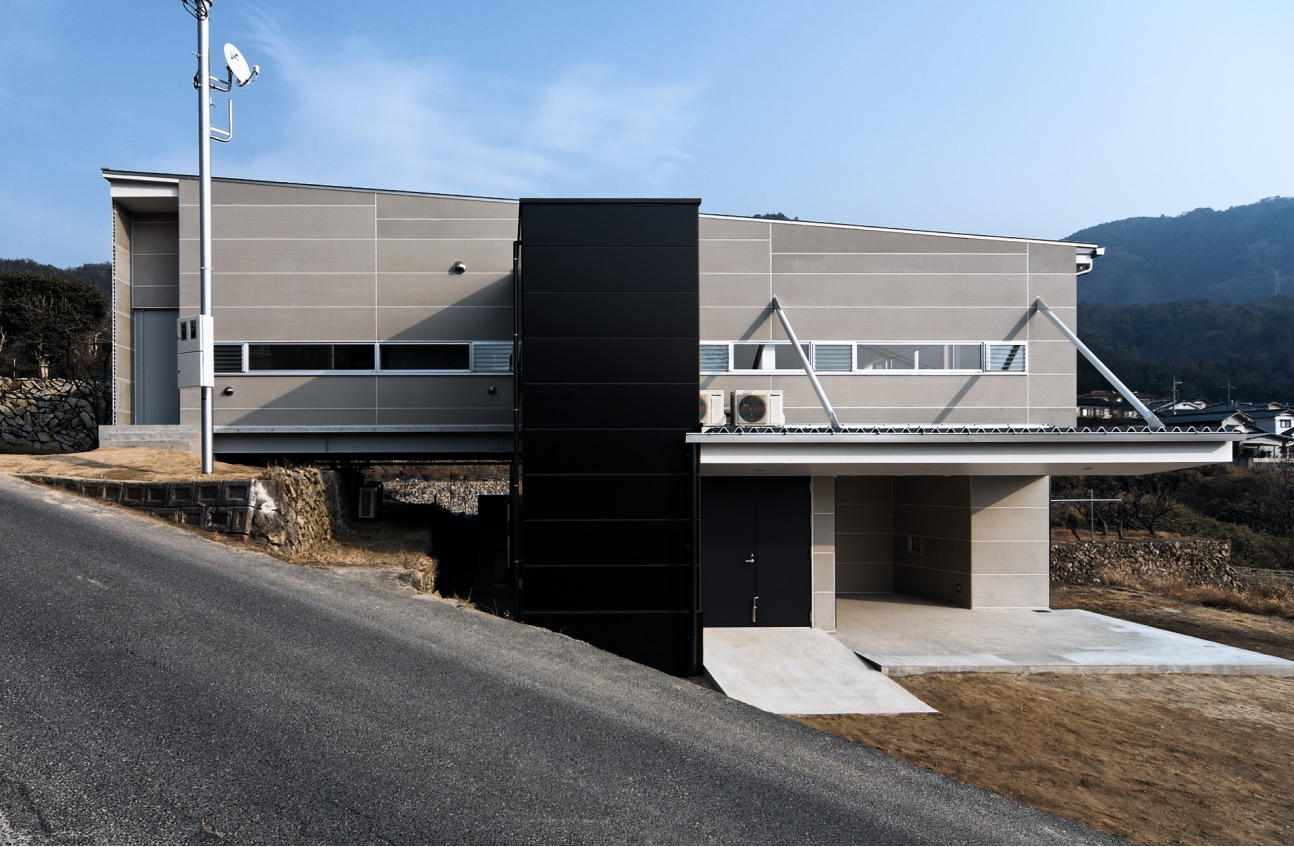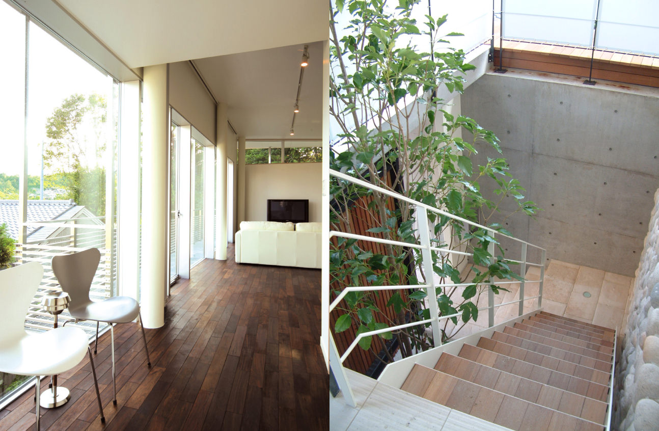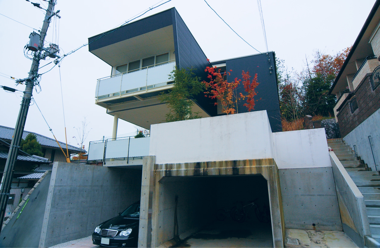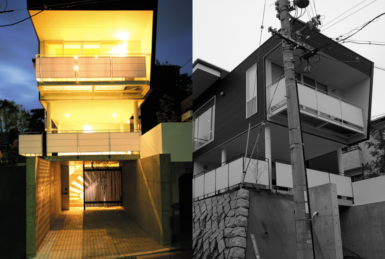 段差に隠れる部分に室外機等を収納するなどを工夫しています。竣工後に付近で土砂災害が起こりましたが、建物の間を水が