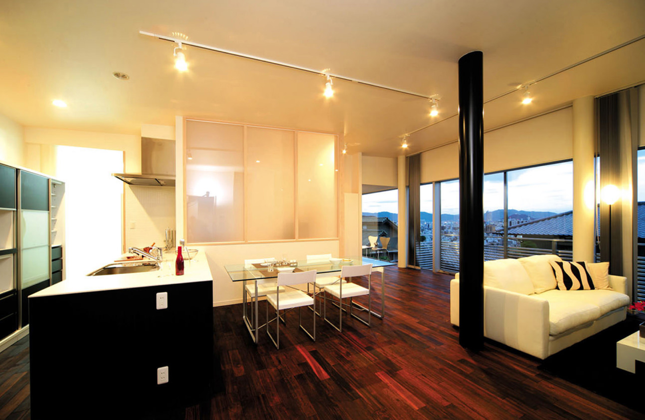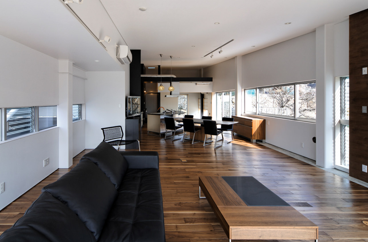 架ける設計に。ブリッジ部分に眺めのよい45帖のLDKを実現し、