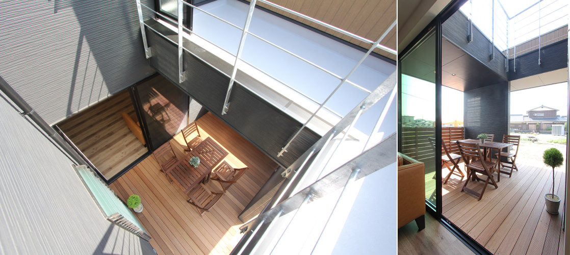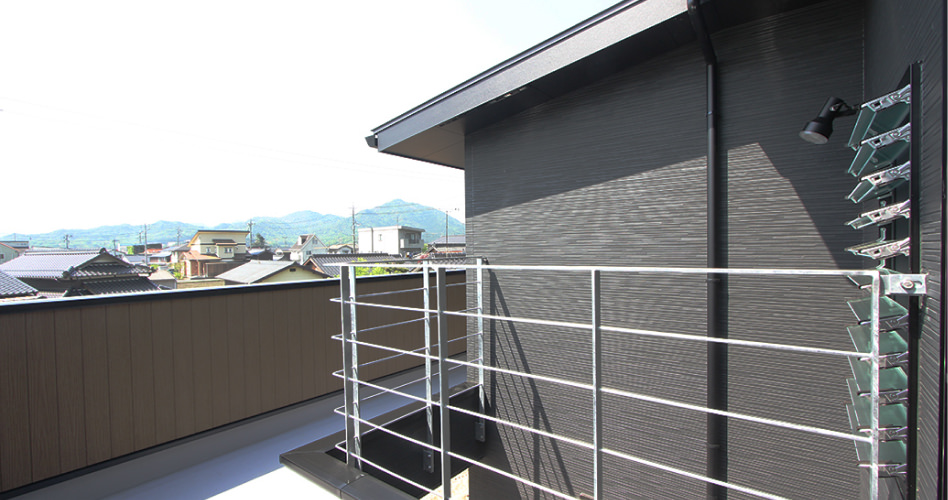 主人が気に入ったのはデッキテラスです。1階のデッキテラスと2階のルーフバルコニーが繋がっている珍しい設計なんです。リビングからバルコニー越しに空が見えるこの開放感は最高! また私が欲しかった吹き抜けを、バルコニーで作ってくださっていることにも感激しました。1階のバルコニーは主人が友達を呼んでバーベキューなどをしています。外からの視線が遮られるようにプライバシーも確保してくださっています。