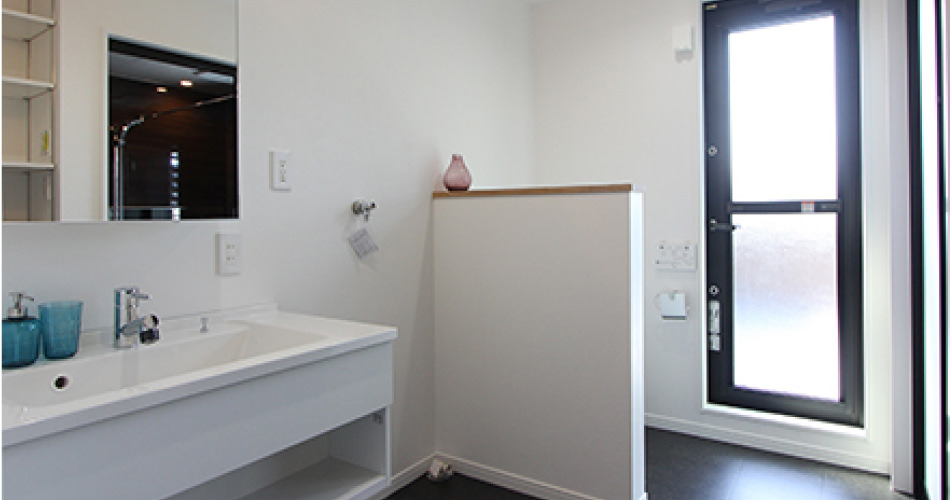 迫谷さんが考えてくださったプランで一番気に入ったのが、バスルームと洗濯スペースが2階に集約していること。最初はびっくりしましたが、衣類に関する家事が全て2階で済むことに感動。バスルームがない分、1階を広く使えることも「なるほど」と感心しました。2歳と0歳の子どもがいる我が家にとって家事の軽減は、とてもありがたいのです。