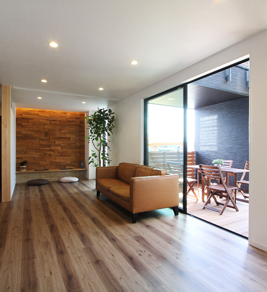 家づくりにそんな夢を持っていたN様ご夫妻。1階はLDKとデッキテラス、2階は寝室とバスルーム・洗面所と、フロアごとに役割を明確にし、繋がりをもたせた住まいとなった。
