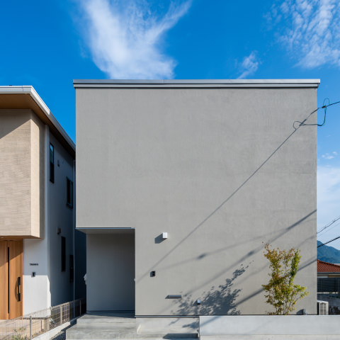 一方、材質やディティールにこだわったのがご主人。床に木目を使わずコンクリートに近い雰囲気という希望には、似た風合いでソフトな感触の樹脂モルタルが選ばれます。また、外壁では味わいのあるグレーの外壁を求めて、明るい灰色から暗い灰色まで、周りの家の外壁の色も見たりしながら、カラーチャートを見比べて理想の色合いを決定。特に玄関側の外観では、できるだけ突起物がないシンプルさを希望。それらも阿吽の呼吸で迫谷さんが叶えていきました。壁面と一体化したドアに選んだ、半球形のドアノブも「アナログな手触りが好き」というご主人のこだわりでした。
