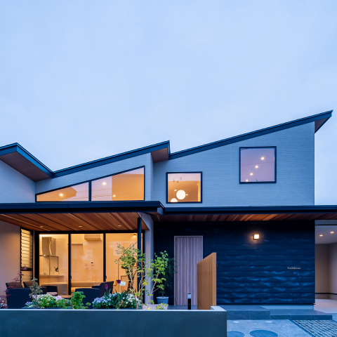 自然と共存する山あいの住宅地。その一角に調和しながら、静かな存在感を見せる住まい。特徴的な大きな片流れの屋根は、施主ご夫婦が望んだ「繋がり感のある空間」を実現する過程で生まれたアイデア。その形がスキージャンプの巨大なジャンプ台を彷彿とさせることから「ラージヒル」と名付けられたそうです。家族がそれぞれの気配を感じながら過ごせる、ほとんど仕切りがない大空間には、その日の気分によってお気に入りの場所を選んで過ごせる、まるでカフェのような多彩なスペースを内包しています。30代のご主人と20代の奥様に、住まいが生まれる過程をお聞きしました。